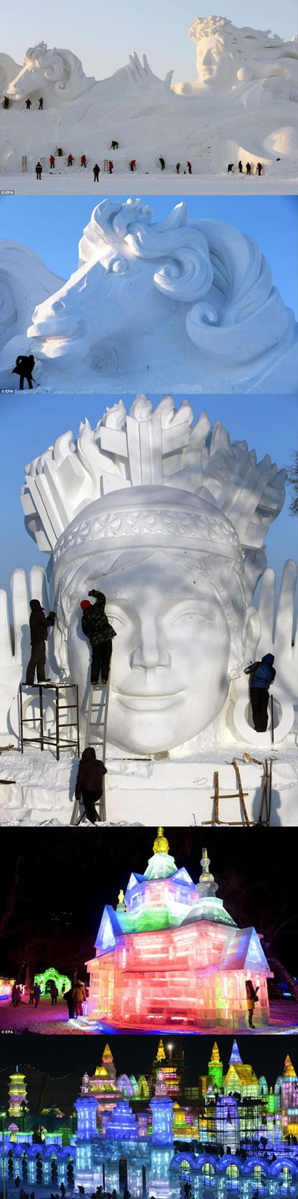Scenes From The 2014 Harbin Snow And Ice Festival January 7th, 2014 Nearly 10,000 workers were employed to build the ice and snow sculptures, which require about 180,000 square meters of ice and 150,000 square meters of snow, for the Harbin Snow & Ice Festival in China.